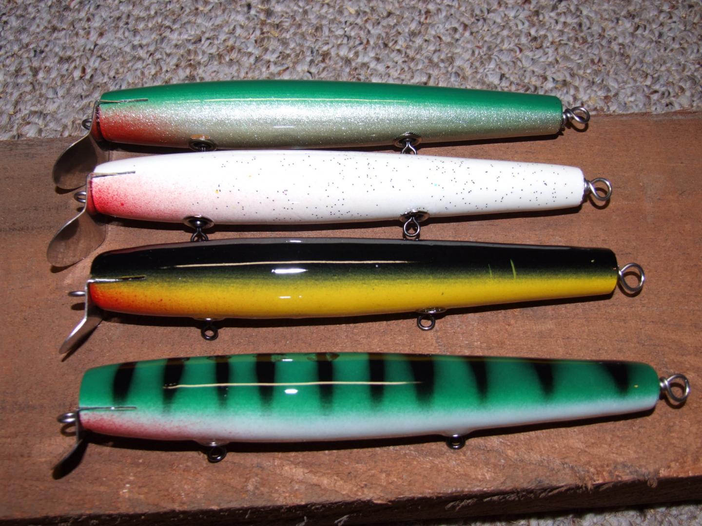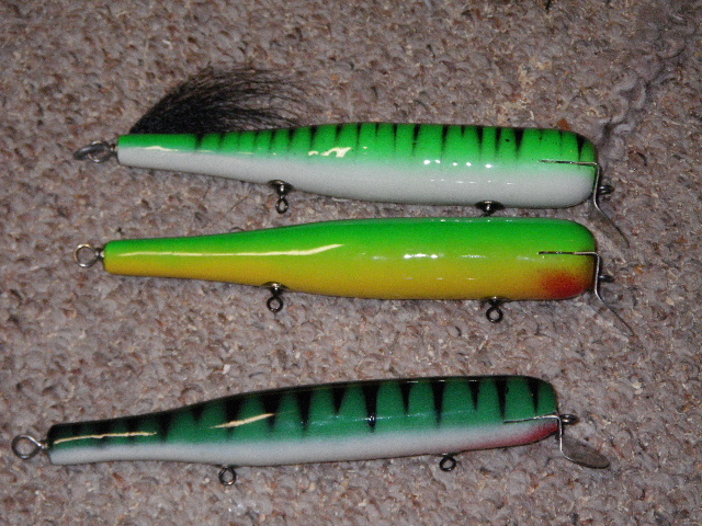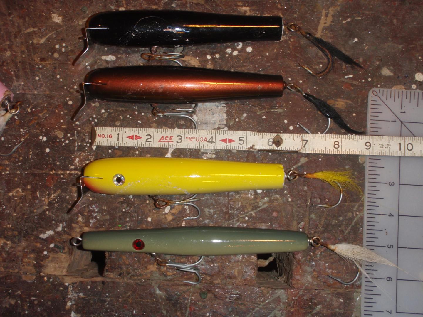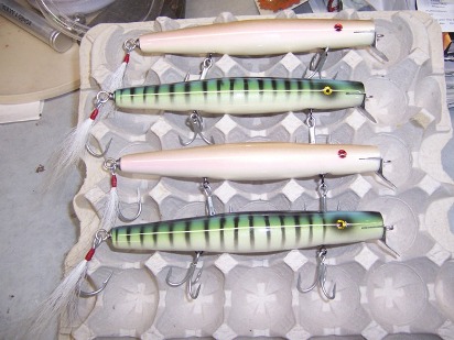 I did ok with pencils this spring. I had some good fish size wise but never really had a lot of fish numbers wise... Seemed like I was always a day early or a day late... That bottom pencil with the peeling paint was one I swapped for at plugfest. Has real nice action and its a lot lighter than mine. I had a few fish mid 20's on it, but I forget who built it ??