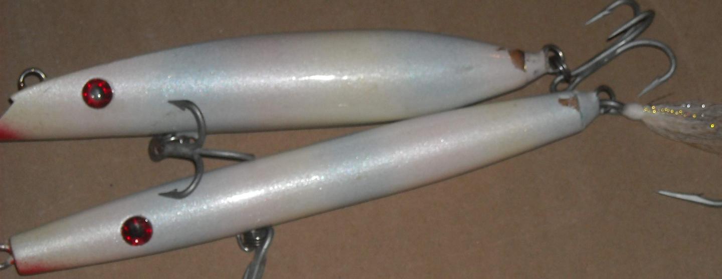 That bottom pencil with the peeling paint was one I swapped for at plugfest. Has real nice action and its a lot lighter than mine. I had a few fish mid 20's on it, but I forget who built it ??