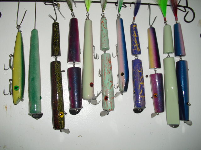 How big is that? I make big swimmers as in the pic. Most are 9"s up to 12"s on the jointed plugs. I have found that because of the size, they swim better jointed. I took them out yesterday to swim them, and am happy with the action. That large darter I am especially happy with. I've never seen a plug swim like that one. It doesn't dart like a typical darter, but swim below the surface in a "S" pattern. It really looked awesome!