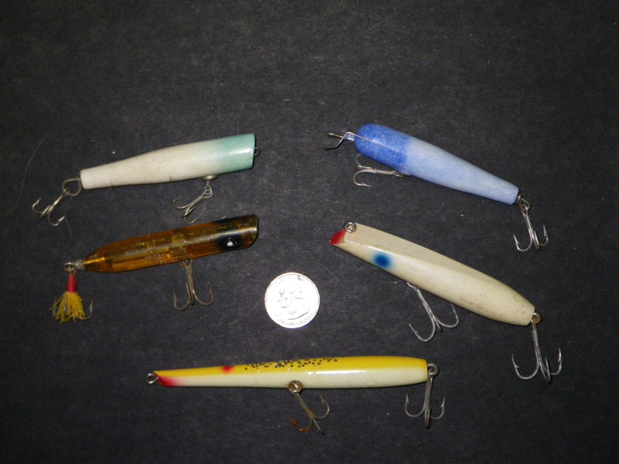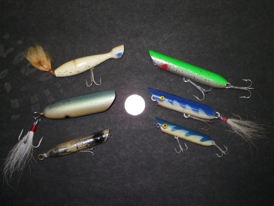 Left is a Gibbs Polaris, Lu copy of a BM peanut, and the best little popper, a small creek chub striper swiper.