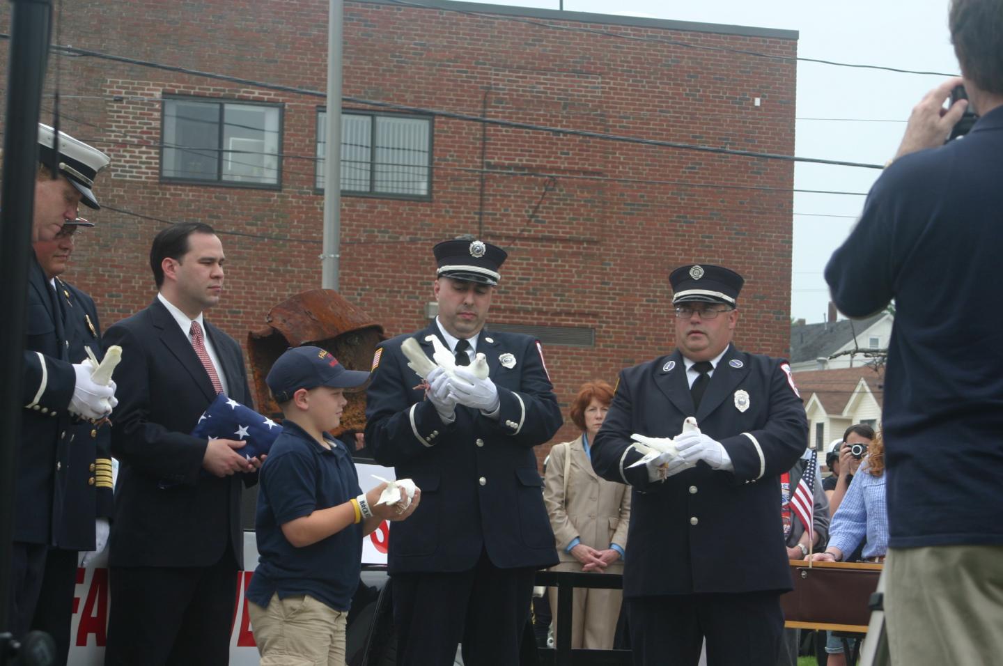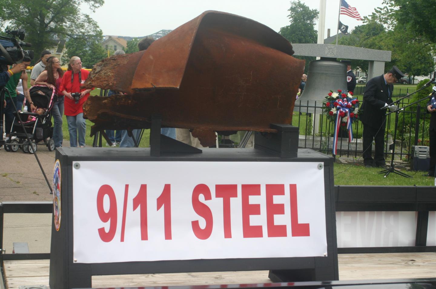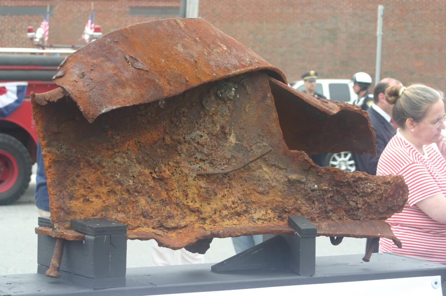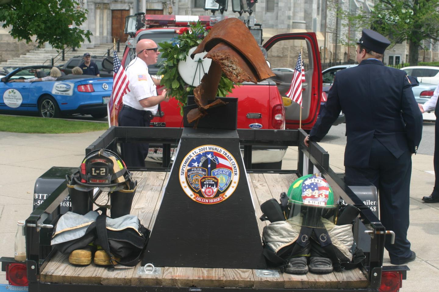 The Fall River Fire Museum had an unveiling of the piece of steel we were awarded from the Port Authority. We drove to N.Y. to pick it up and today it was in the Memorial Day Parade. For an hour or so before the parade it was on display to the public. It was really neat to see the overwhelming response it got, people driving by stopped to see it. Without saying a word they got out of their car, walked over to it, put a hand on it and stood in silence. Very moving.