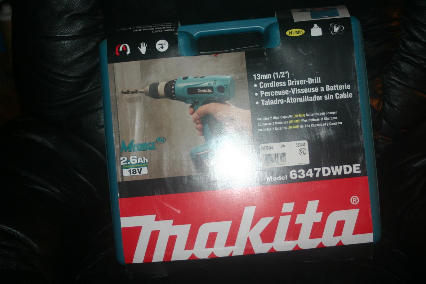 18v Makita1/2" cordless model #6347dwde. New, NEVER used, still in cardboard wrapper. Includes drill, charger and two batteries. (case too)