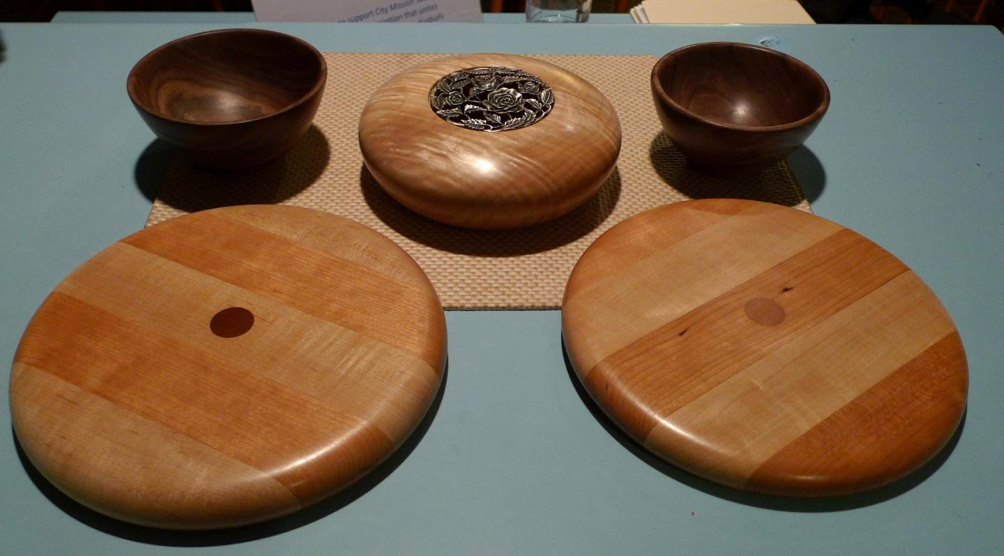 My table will have turned wooden bowls, salt & pepper grinders, laminated maple/cherry cutting boards, wine bottle stoppers, cherry 3 legged stools (great for next to fireplace or wood stove), and Blond Terror Striper Plugs.