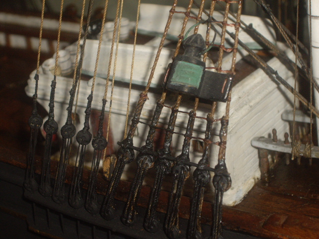 The model came from the estate of a George McQueston 1887-1975 who made his fortune importing quality wood to the shipbuilding and homebuilding (finish) industry. He was well to do as he got Mass license plate #4.... all during the post-depression time that Mayor/Governor Michael Curly pulled #5 for himself. If I had to guess, the model was made in the 1930s, possibly earlier, so no plastic, all lines go through working blocks, and all knots appear to be tied, not just glued. I was in his house in the 70s, so I know from all the high end wood trim in there that he wouldn't buy anything but the best. It might be worth some dough, or not.... Depending on an appraisal, I might turn it for a new kitchen, or maybe just a cabinet...