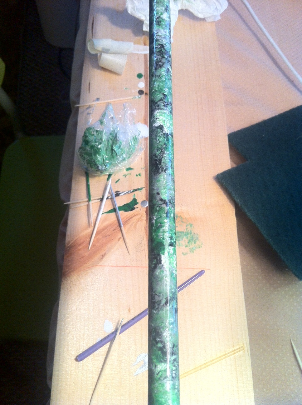 Then instead of a crosswrap i did a green marble pattern, i used testors green, white and silver enamel paints, i put down a thin layer of epoxy and started with white, the silver then green, used a toothpick to swirl them together then a piece of crumbled up saran wrap for the end result. the next day i put one thick coat of epoxy over it, smooth as glass now. see pic 3