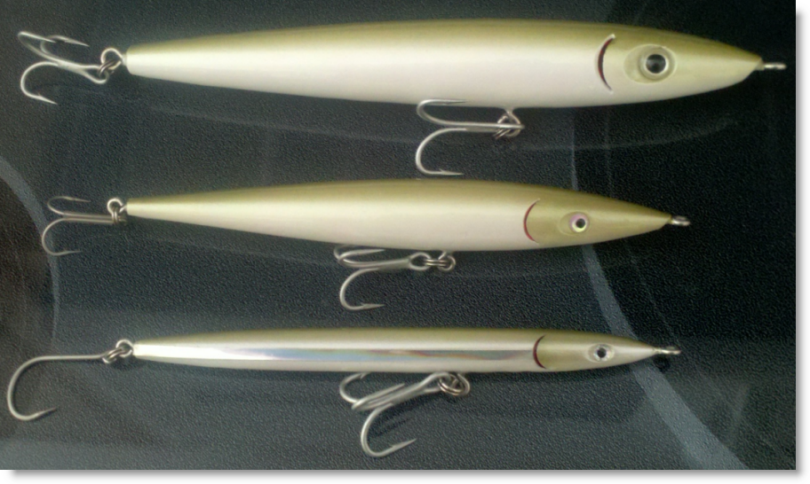The one in the middle is already gone -- it was gouged to hell and I finally lost it to a good fish the other night. This is the first needle I've built that I could swim exactly like a tandem-rigged Slug-Go.