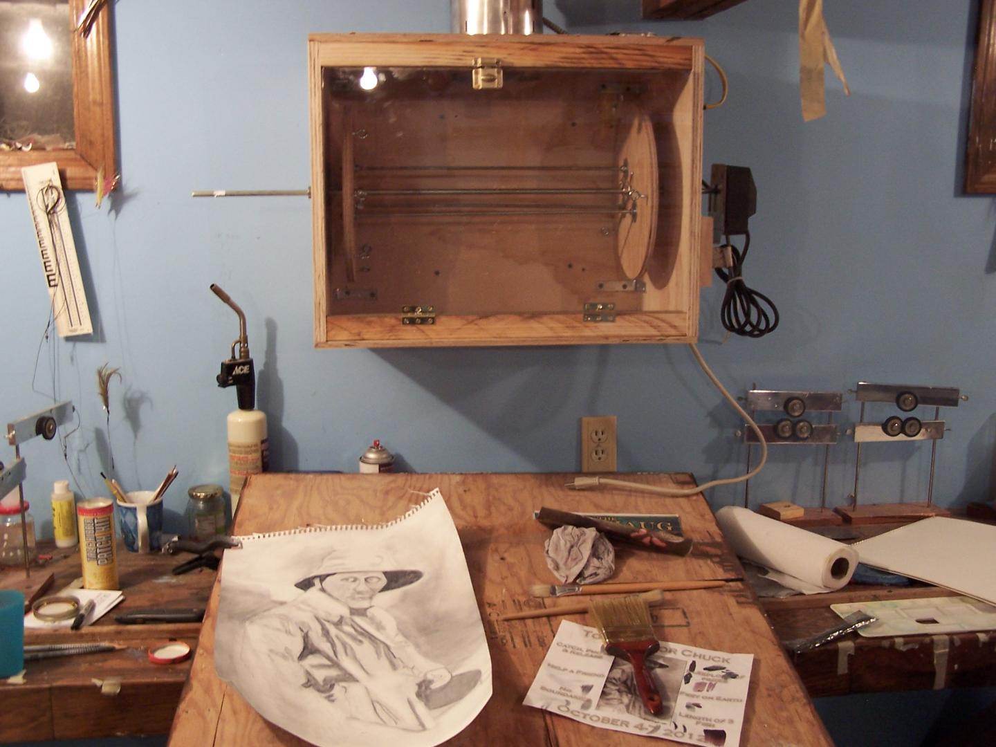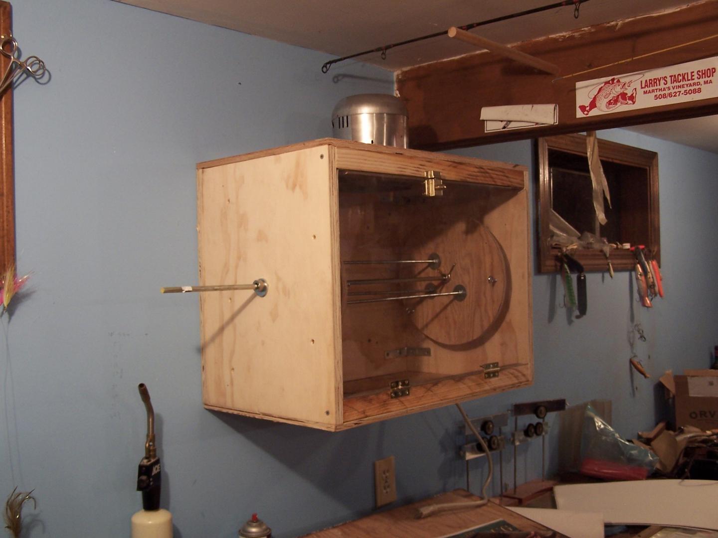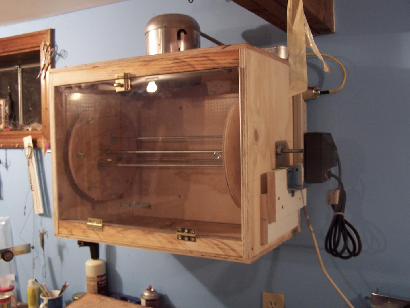 Here it is hanging on the wall, waiting for the first batch. Thanks to Rockfish's and the Professors suggestion I went to Lowe's and found a wide variety of square steel and aluminum. I bought some 5/16's round aluminum stock and squared it up on four sides so it fit the rotisserie motor just fine. Thanks for everyones suggestions and tips.