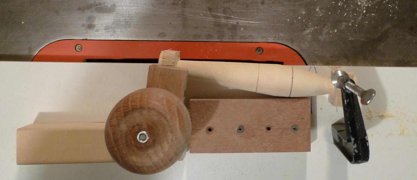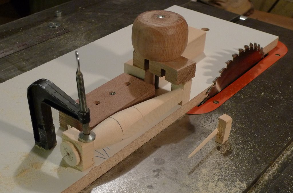 here are some pics.... you need to sight line the piece with the proper marks on the blank but it is safe and easy to use if you know how to use a table saw.
