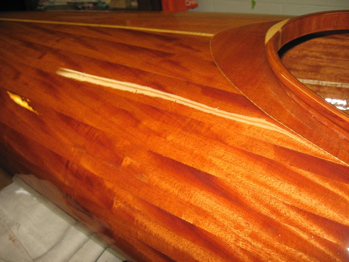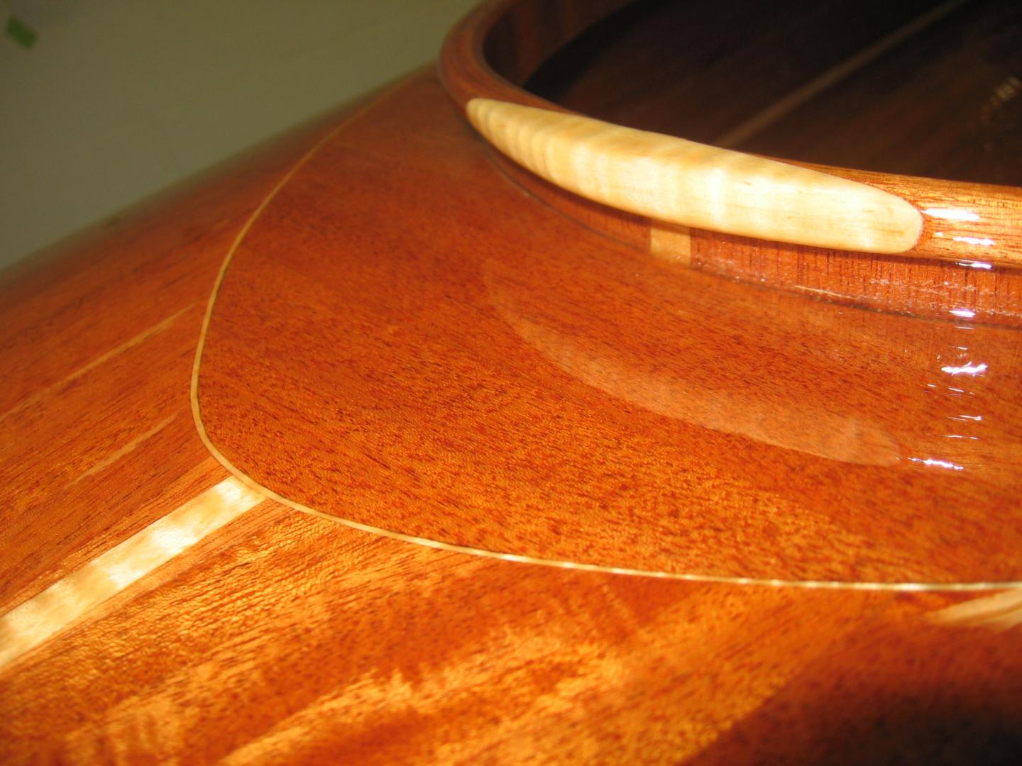 Here's the reason I have not posted plug pic's recently. I've put more than a few hours in this project. It is a strip built 2 person kayak designed by Nick Schade. It took me 7 weeks to get my hands on 3, 19 and 20 foot long pieces of Genuine Mahogany from South America. This kayak is built from one of those pieces that started out rough at 3"x8"x20 feet. All strips were indexed and numbered as they were cut, so the kayak could be built with consecutive pieces. You can see the result in a repeating pattern on the finished boat. The accent pieces are also from only one board from Pennsylvania of nicely figured Tiger Maple. For the most part, only 3 tools were used to strip the hull and they are, a razor knife, block plane and a sanding block. I've got the better part of 350 hours in this project.