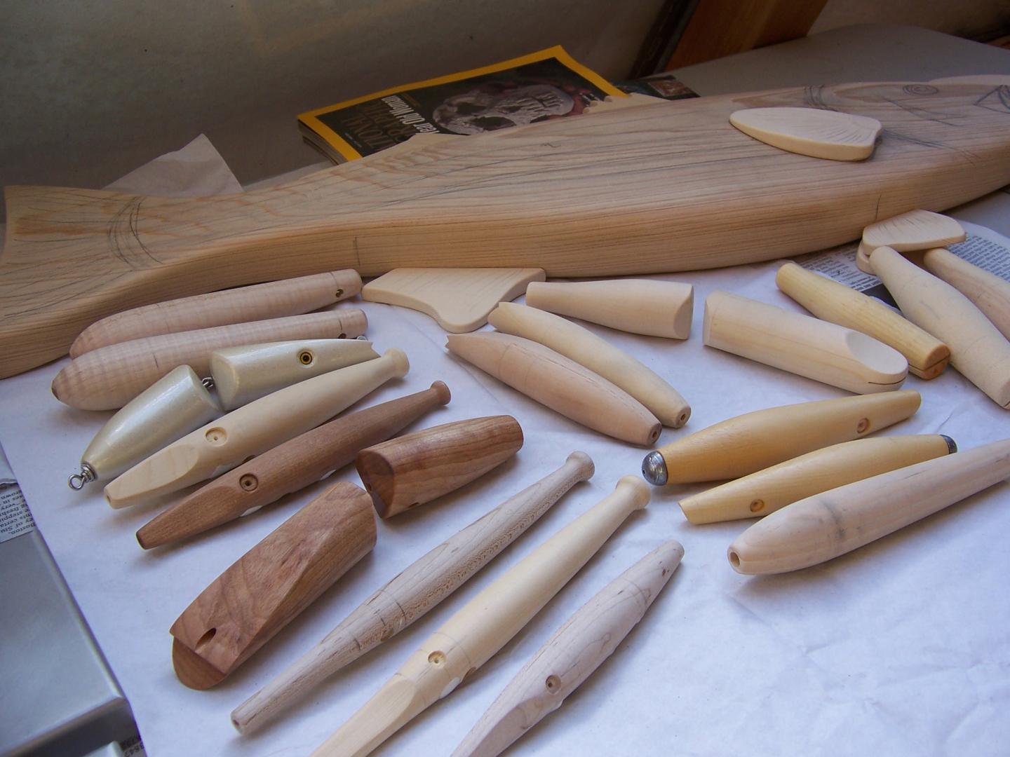 been busy working on several things this fall-winter. Not just plugs. Here is where I am at this point. Got 4 vises pretty much done. Still have to machine the jaw holder but need to figure out which size I am going to put in so that part is un done. This has taken most of my spare time since last year but I want a new rod or 2. Then I got a cypress striper with ayc fins to maybe hang on the wall down the cape or a weather vane. Still got to figure out the finish and such. Probably end up looking like this next fall too. Only so many hours in a day. Then plug wise I got 1 jointed darter done for a promise. a couple tiger maple Bass Aquas for a promise. For me I have some needles of various sizes. Some I already make and a few new ones. Some top water stuff , canal and a Gibbs copy. Darters. A Pichney jointed so I can give VB back his original. A large and small Pichney Danny and a med. BM Danny copy. AS you can see I got lots to do before I get them done and this weekend has been all snow removal