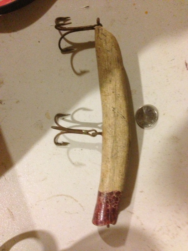 wood darter type plug. screw eyes. by the looks, only the red head portion was painted. got it at an anitique store in maine for almost nothing and was curious. swims on top with kind of a rolling/sway action. guessing hobby builder many years ago.