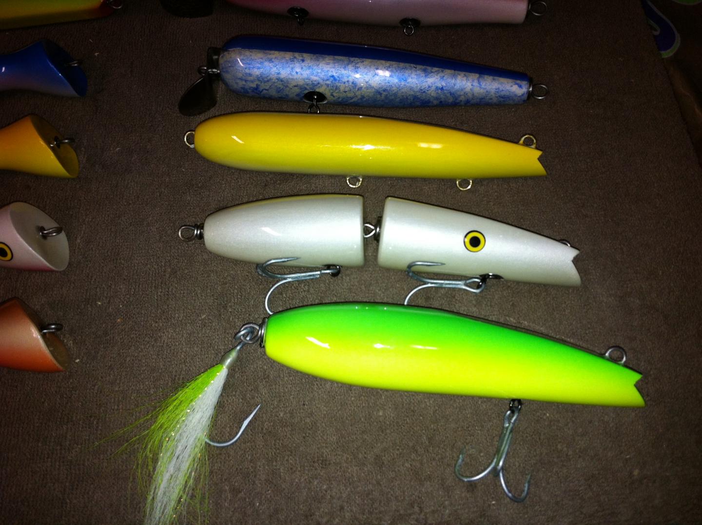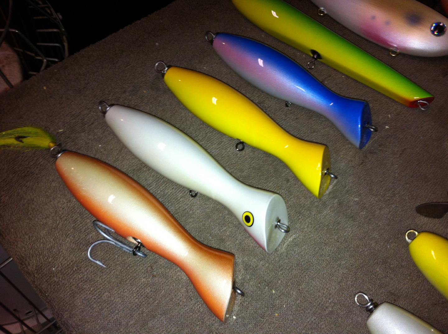 Just about done with building for a while. Here are a few of what I have been working on. Lg Pikie, Frech Banana's out of white cedar, Gibbs CCC special, Musso lipless, Cutty popper, A54 Jr., Frech Darter and a jointed Musso style and one of my darters. Big thanks to Numby for the help on the Lipless', they swim great and will be in my bag this year.