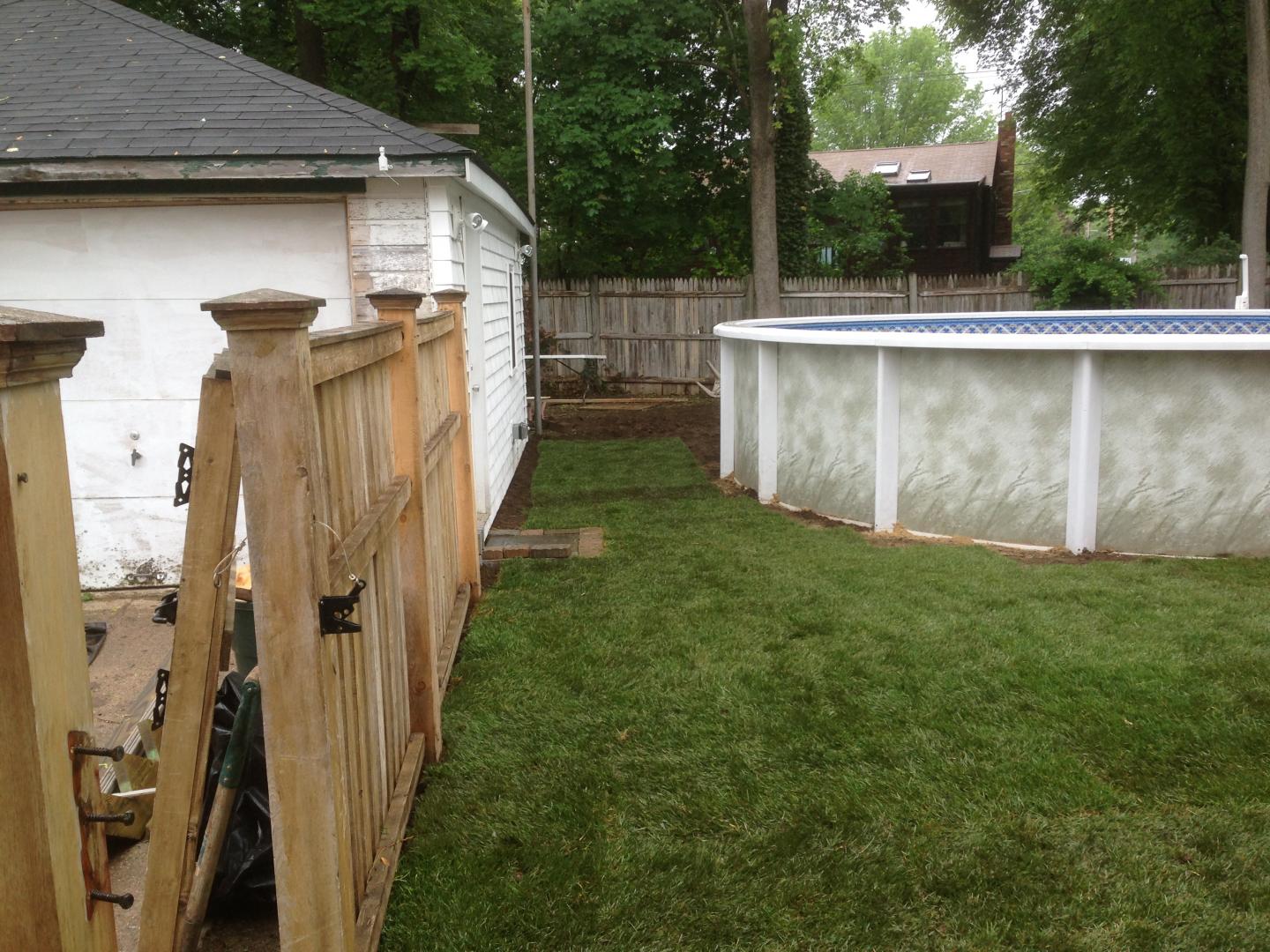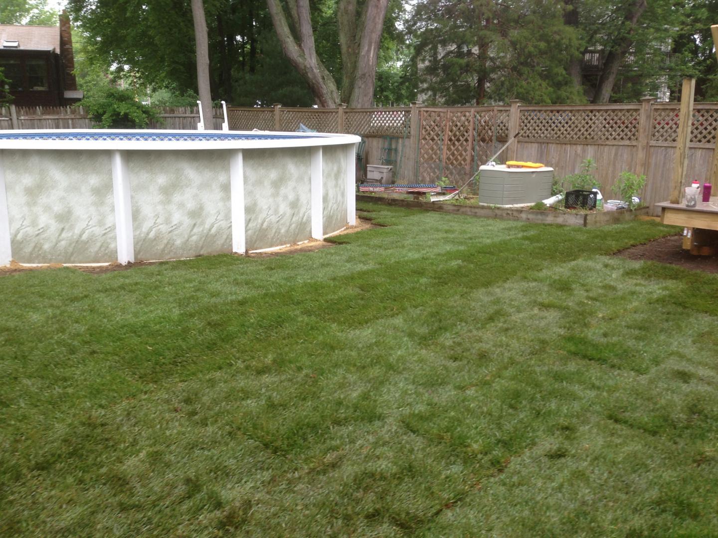 This past weekend I dropped another 550 Sq feet of sod down on the area behind my garage and pool, this time had no help and did it all by myself.