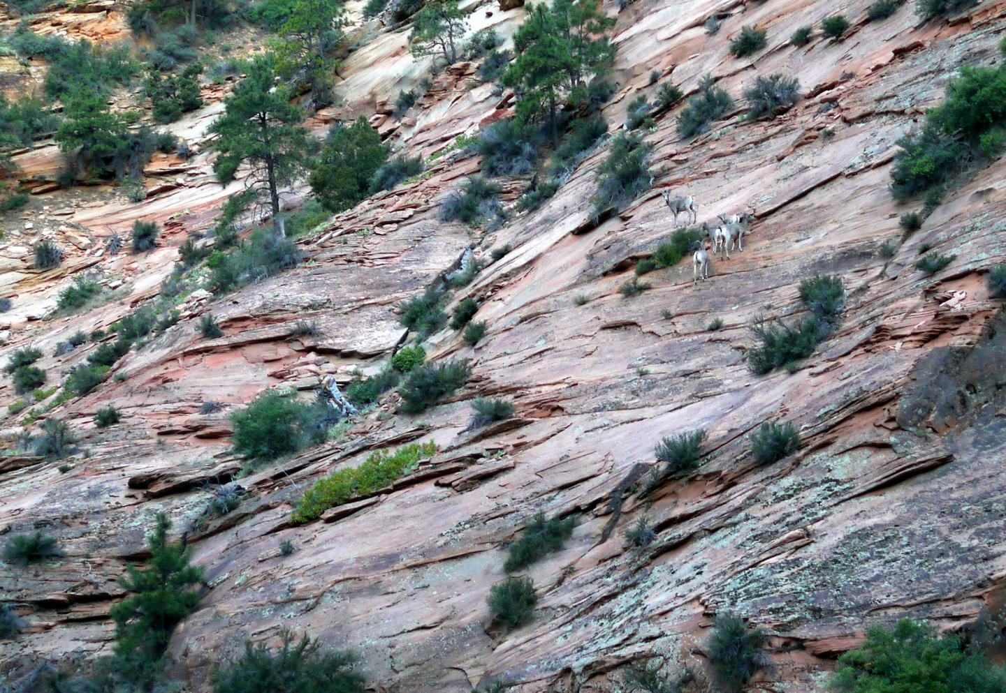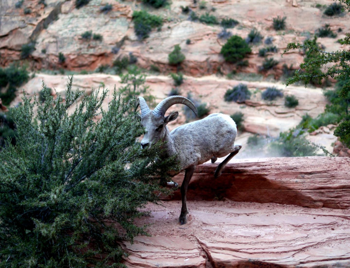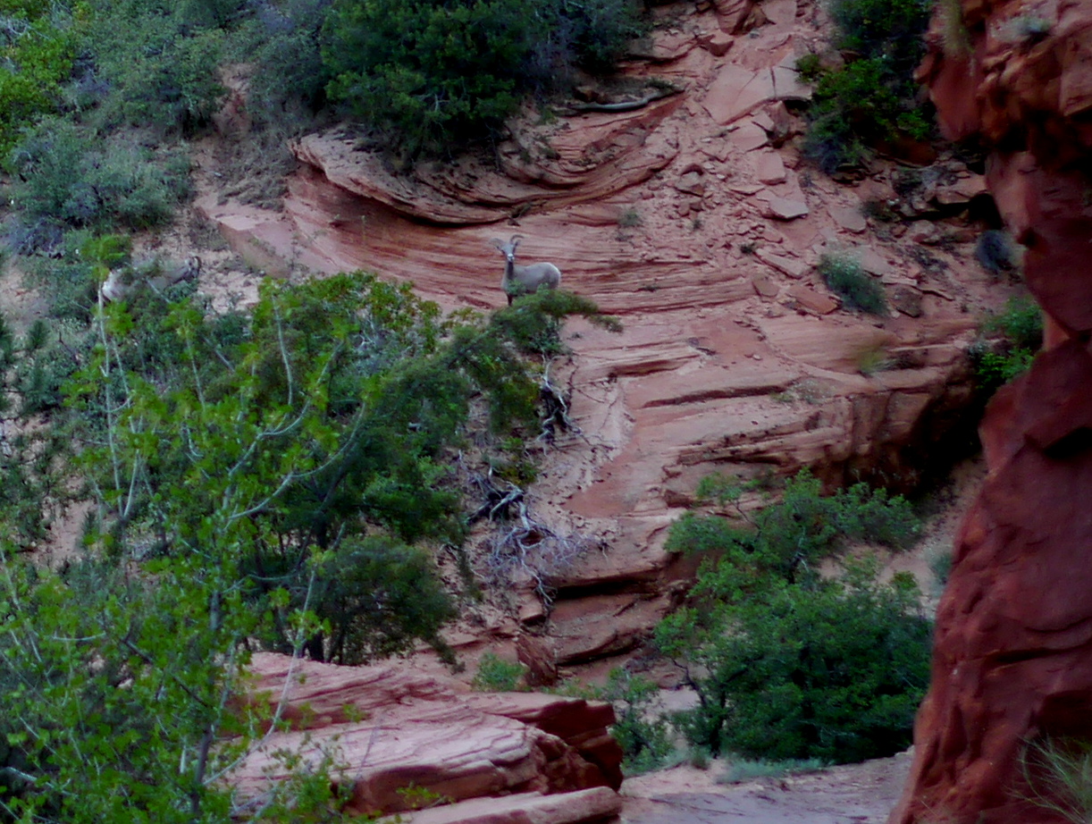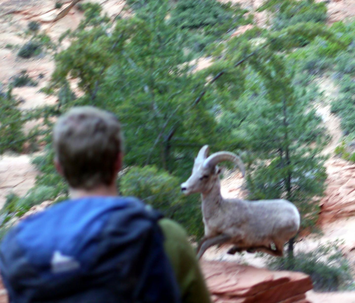 Suddenly he came flying around the bend in the 5 foot wide ledge trail and looked like he was about to head butt Tim. He darted just around Tim by about 6-12 innches and then past me. I was able to snap a few piuctures as he flew by and then lept across a small ledge drop and stopped on the rocks above the trail 30 yds away.