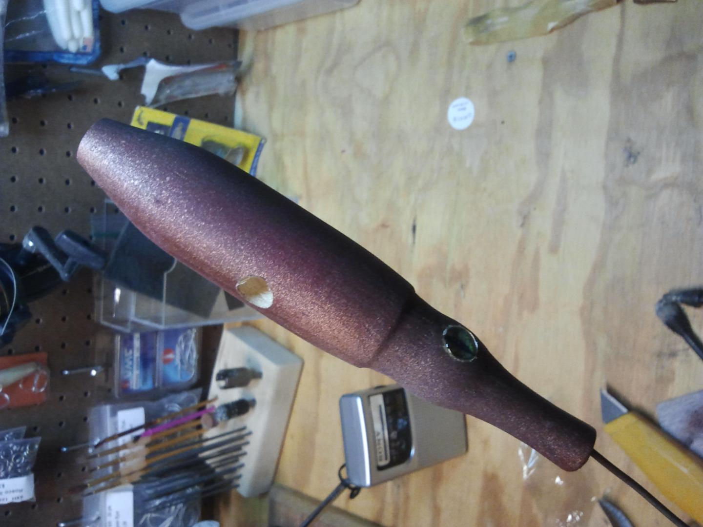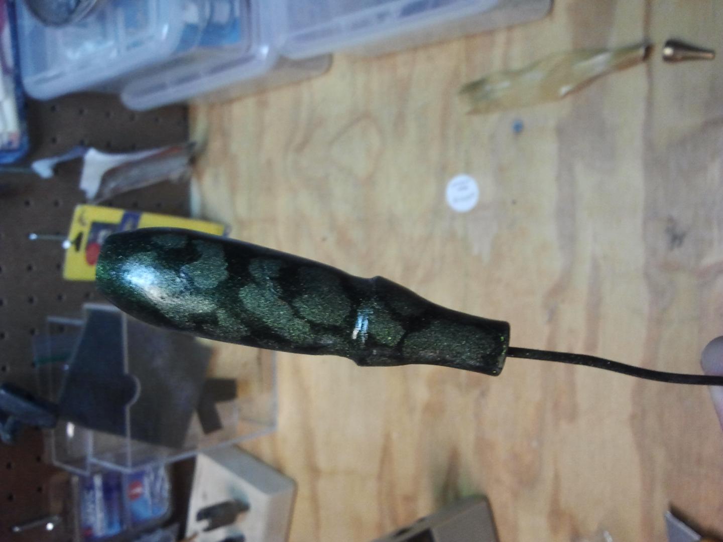 Just a few squid shapes, just getting used to the lathe....not weighted, tested or rigged....just turning and trying different color schemes. The dark picture is actually me trying to show the glow in the dark coming through the paint. Really cool, but a b#$ch to catch on film!