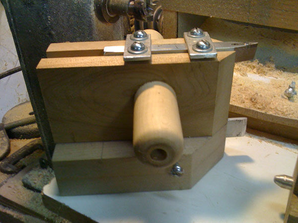 As far as getting the cutter height exact, you can do it with shims. The groove is pretty tight side to side on my sled but about 1/8" too deep for the tool holder. I have a small block of maple in the groove as well as a couple of shims to tweak it to the correct height. The shims are made out of some stainless I had leftover from making lips. Everything locks down tight and works great. You can see the end of the wooden shim sticking out of the groove at the back of the sled in the photo on the right. The 4 #12 screws hold everything firmly in place.
