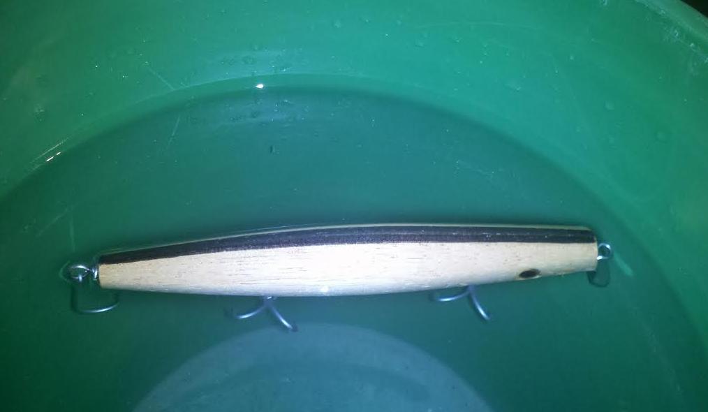The other extreme is a similar shaped plug I call a skinny donny. It is about 7.5" long, 1.2" wide, and uses a low slot midsized donny lip that is mounted a bit above midline. It carries as much as 15-17grams of weight a bit behind midpoint. It weighs around 2.75-3oz and casts very well. Floats level with tail just under and water line above midline at head. It is made of AYC. It can't carry anything more than cut 3/0 hooks. I have to bend the line tie way down to keep it near the top, even with a low slot lip. It rolls something awful…..it will do a 360 degree barrel roll with a twitch of the rod tip. Nobody would intentionally choose to build such a poor swimmer. It has taken more large fish than anything else I build, including 3 fish over 40 lbs.