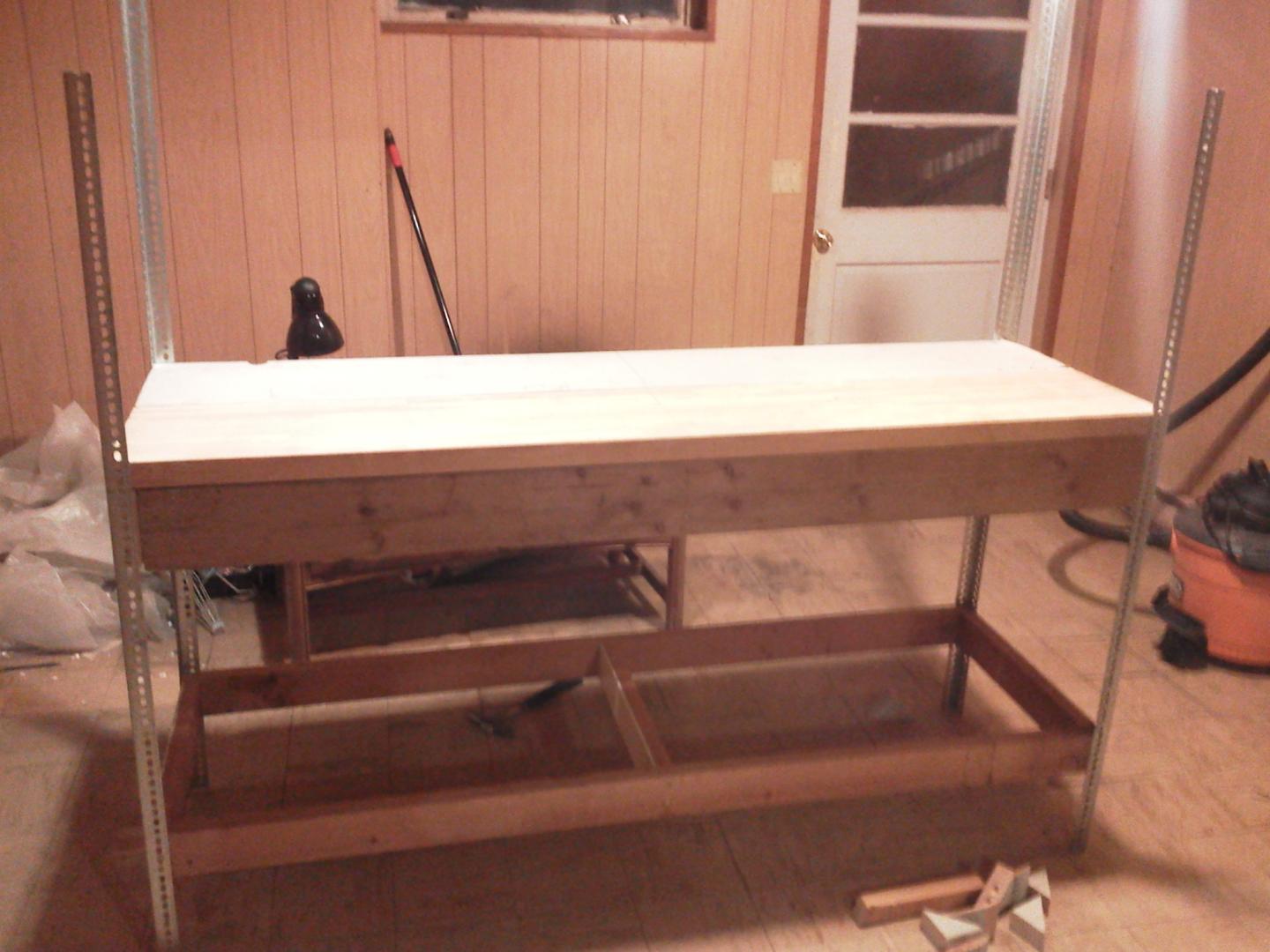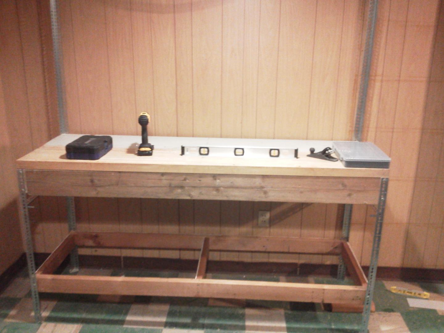 finishing up a 72" workbench made out of all scrap wood, except the uprights are slotted steel. I'm one scrap piece short of completed lower shelf, and waiting on steel pegboard delivery. Pic #1 glad I bought uprights that were longer, before cutting the front uprights I noticed some extra wiggle to the bench and had enough extra length to cut and stiffen up the wiggle. Plus the predrilled slots fit 5/8" slot bolts to lock it in. Still may buy one more to cross the front, but will see if there is any sway while the lathe turns. The 3rd pic I mounted a piece of aluminum from a closet demo. The Al. is the bottom track for sliding doors which will serve to hold pencils (writing pencils), and pens/markers. The rest of them I mounted to the wall (not picutred) on 1x3" furring strips to hang plugs and hold misc stuff