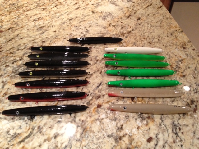 Going into building I knew that I wanted a pretty large needle, something like a Wadd but that sank horizontally and suspended on the retrieve. I ended up making 8 test bodies out of two different woods and placed weights in various places to try to get it to sink the way I wanted. This took a lot of time but it was fun experimenting and trying to create something that would do what I wanted it to do. I did finally get a needle that sank and swam the way I was looking for so I then tried to make 15 identical copies of that needle to fish this season. I don’t have a duplicator on the lathe so everything was free hand and there is some variability to the bodies but I tried to keep them as close to the original as possible. After sealing, weighting, painting (rattle cans) and clear coat they range in weight from 2.3 to 2.6 ounces without hooks. I did my testing with 4/0 6x hooks front and back which is what I plan to fish them with.