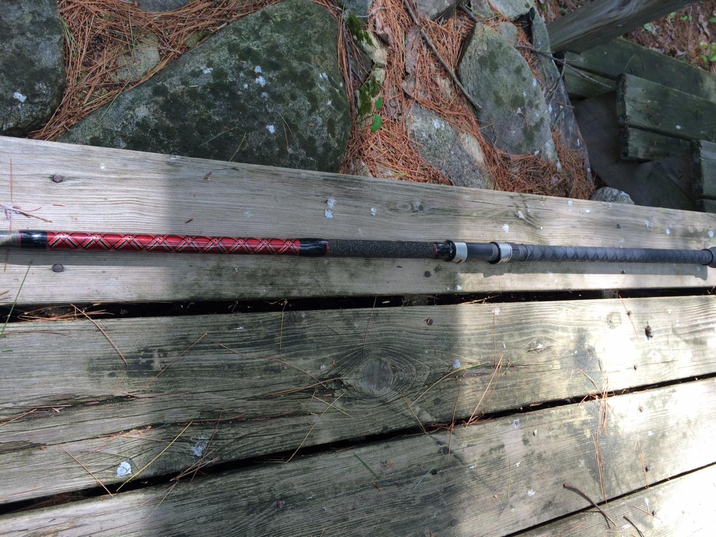 Or Rhode Island eel/sluggo rod. Lami GSB 1201L with 4' off the top i believe. Now its 9'8". CMS built Fuji guides, i forgot the name, don't think it is alconite's, the more metallic lighter ones whatever they are called... I added xflox over the grip. 23" to center of reel seat. I have had the rod for about 5 years now and its been sitting on the rack for the past couple seasons. Great rod, very versatile and can spank a big fish with no problem. Can meet up in the CT/RI area maybe even the cape if i ever get my ass down there this season.