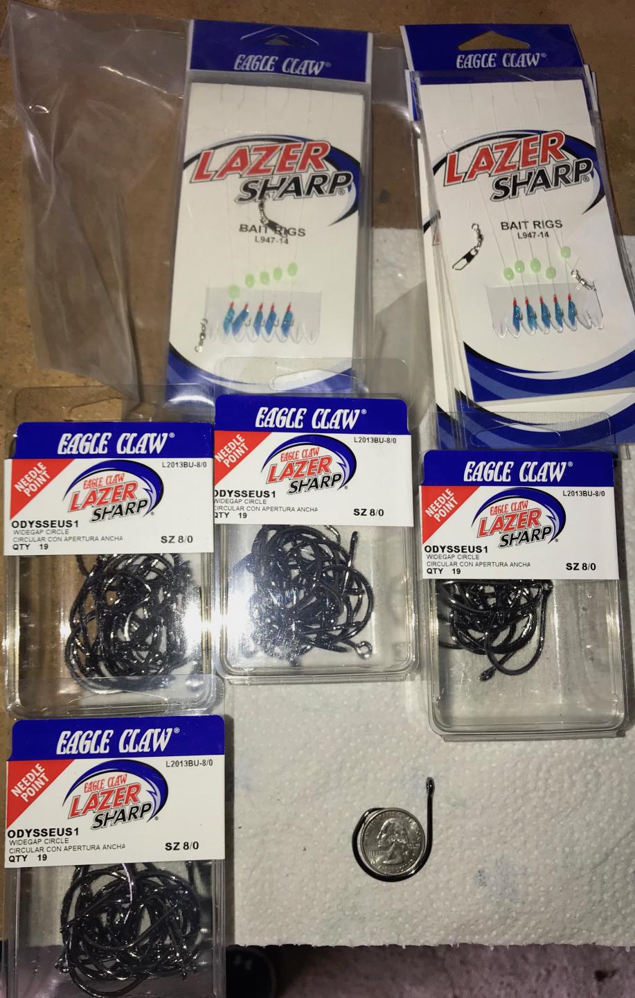4 boxes 19 count of 8\0 circle hooks they are short shank (thats reason for selling)and 12 sabiki rigs size 14 (on the small side) I ordered 24 by accident