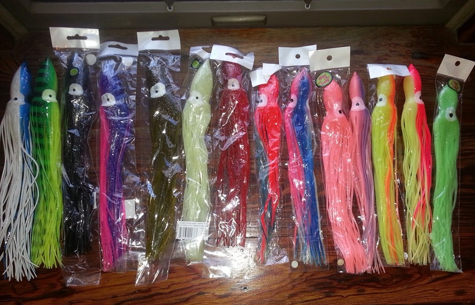 13" and 12" hoochie skirts. Tuna/bass. Glows in the dark. New in package. Have large quantities available. $1 per piece.