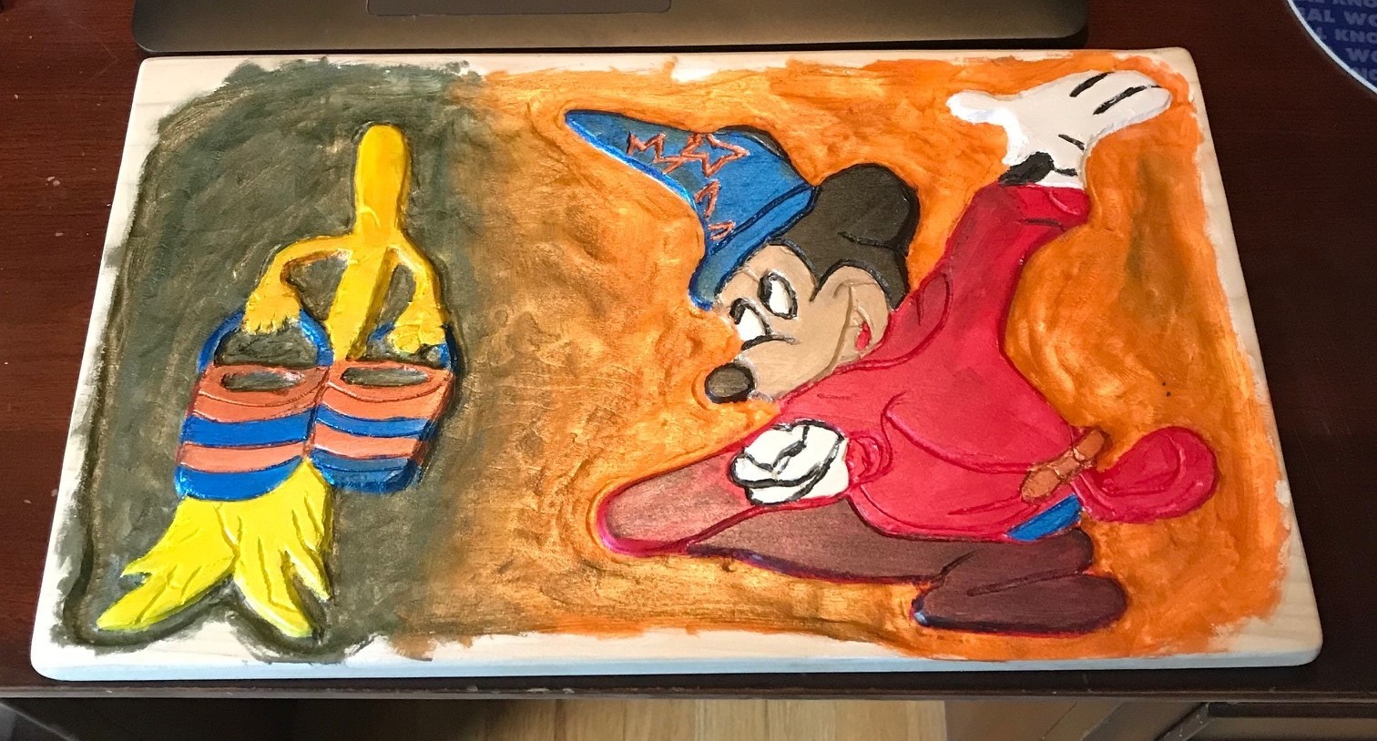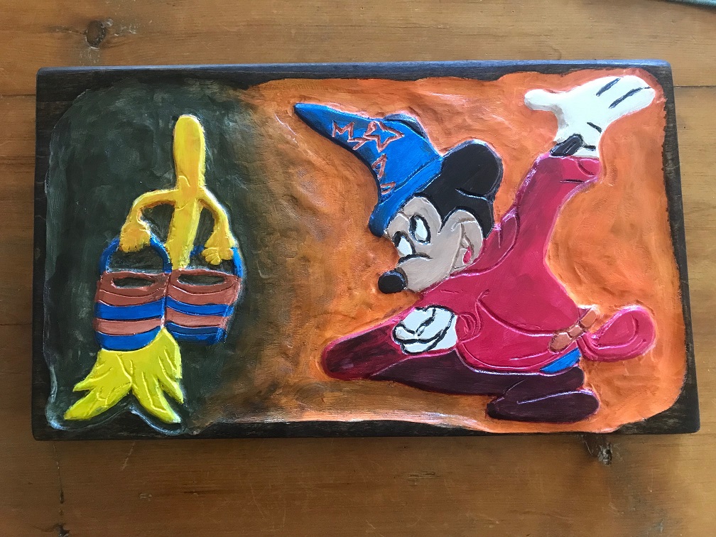 Took a 14x9 piece of poplar to experiment with a new power chisel to get the outline done, finished off with dremel tools and Makita grinder with aggressive wheel. Just finished off painting and since the only other painting I've done involved, walls, trim and siding; I'm happy with the outcome. Plan to seal the painting with probably some spray varnish, sand the paint on the perimeter and stain the wood to finish it off. Since I have no grandkids at an age to appreciate, I'll probably put it up on the marketplace on Yahoo. Took a lot more time than some of my chainsaw carvings, but I really don't know how I'm going to price this yet.