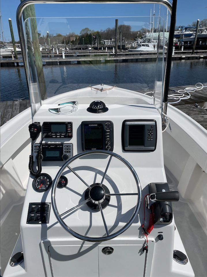 Furuno FF, Garmin GPS, Standard Horizon VHF, Clarion Stereo
