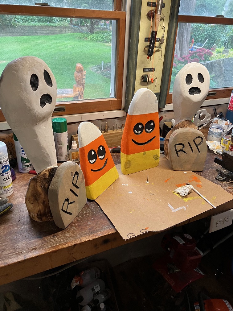 Can't believe its almost October, it's raining out, so I did some painting in on some Halloween carvings.