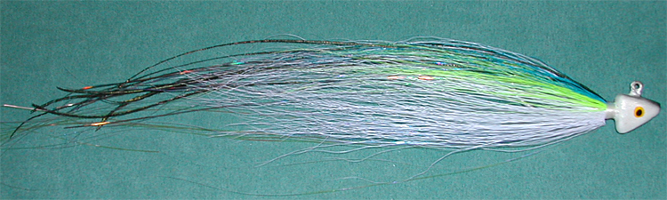 They're based on large flatwing flies that I tie (See Saltwater Flyfishing Board). The tail is created by tying long saddle hackles in horizontally one on top of the other. There are certain situations where I've never felt that I could get down deep enough with fly fishing gear (plus the distance on occasion). So now, we'll see if these work. The big flatwings have produced some very nice fish for me over the years....