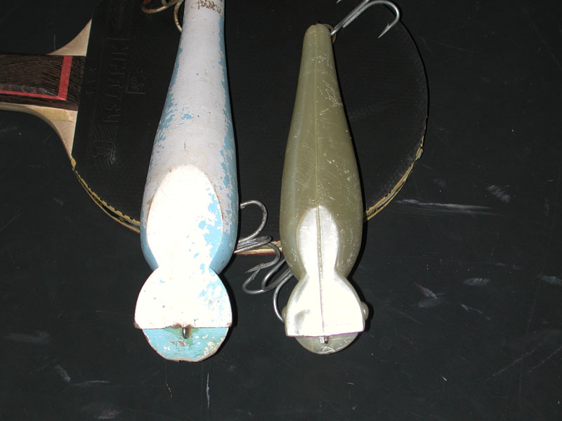 The original was plastic, made by Magna Strike about 10-12 years ago. The ivory pearlescent color fishes well, really well. The other is a pine "copy" I made years ago (before aesthetics were invented). It has taken me some decent fish plugging rocky shorelines during the day by boat.