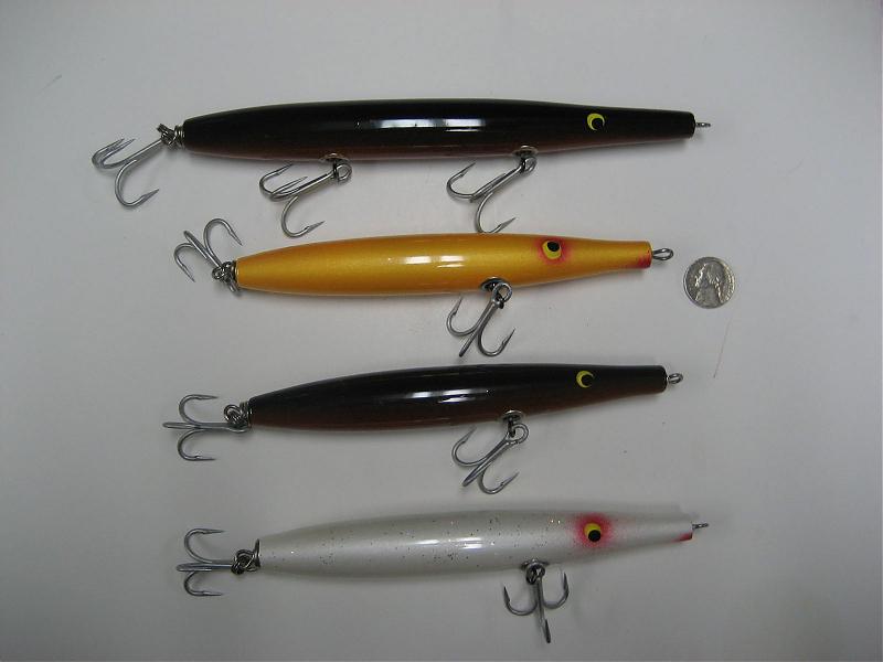 .....is better than nothin'. Needles are dull...but do the job.....here's my latest take on them. Maple, 6", 2oz, (8"/3oz proto on top) sink mildly tail down, swim rather than wake, can get 'em to glide too....like a sluggo.....with a fast jerky retrieve.......can't say the fish went crazy on the original....but I like the shape and action so we'll see.