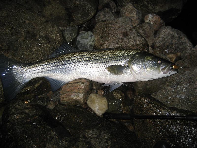 The perspective is funny, Eddy, the fish is bent. But I did measure it (fork length). That's the butt of a 10ft conventional closer to the camera. Tough reviving them when the water is this warm, I was suprised to find them there in numbers. I think your trip next weekend is looking promising. Consider putting some extra time in at the coves.....where the peanuts congregate. The fish were hitting big skin swimmers as well. The scent of bunker, even if small, must turn them on to big plugs. Lot of spearing around too. Take and try some teasers when you go. My friend had three plugs taken from him on doubles last night.