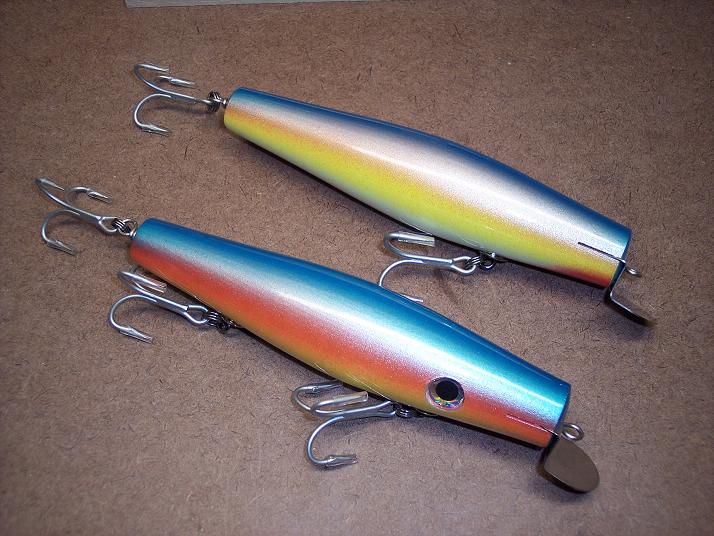 Working on some new styles and colors and I just wired a few up! Thought you might like a preview of what you might find at the upcoming fishing shows this season!  Here are the new 3 oz. Dannies! They will come both "blind" and with eyes and also with 2 belly trebles and single belly trebles! Pictured is a color combo you have seen before....the classic "Rainbow"! Also a blind bunker!