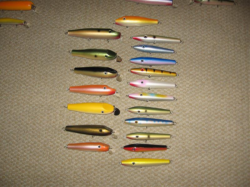 Well my usual assortment of stuff, Dannies, based on Mac's old dannies, Whats up and thanks Dave. Howdies, respect to the king of howdies, Bernzy. Where are you man? Pikies, Macs again. different sized atoms. And my new favorite Jake jrs. They swim on top like a pikie with quicker waggle.
