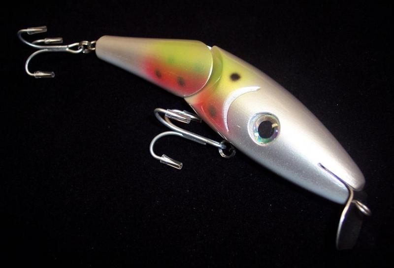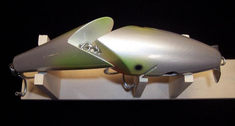 Also been working on a few new jointed versions of the "Prey" swimmer and my 3 oz. Danny! Have not had these in the water yet as they are prototypes but they will swim soon! I think the design will provide a tight wiggle with th water flowing into the joint! I like the result though!  Fun to try to carry the paint over from front to back...gives a great result!