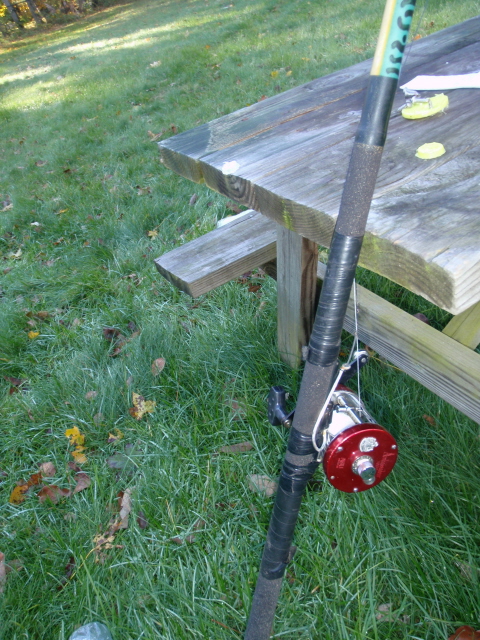 Allstar 1088 Spin I wrapped on the kitchen table a bunch of years ago. You would be hard pressed to find an uglier rod, but it does catch fish. Hardloy guides with discolored black wraps, sic tip, Fuji seat(slightly out of line), missing but cap. Makes you wonder how I could ever part with it? Blank is worth $100, let's try $100/b/o.