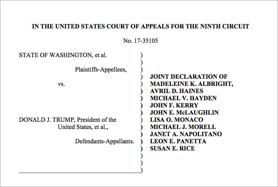 “We all are nevertheless unaware of any specific threat that would justify the travel ban established by the Executive Order issued on January 27, 2017. We view the Order as one that ultimately undermines the national security of the United States, rather than making us safer.”