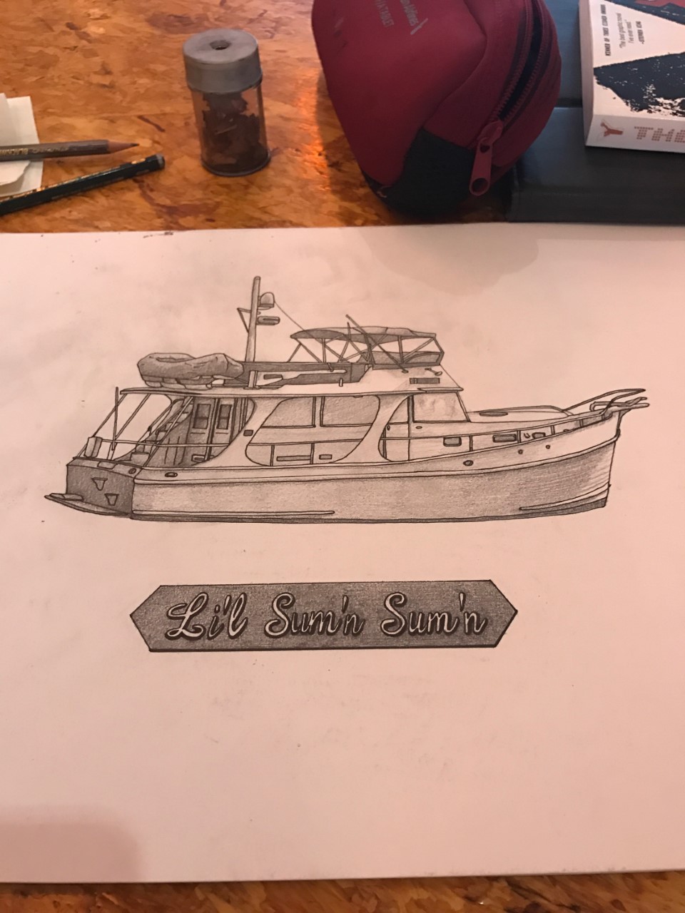 I did not see this one completed, but looked great. It also was done from a photo and was commissioned as a gift for someone across from them on the intercoastal waterway. Not sure what the finish was, ink, charcoal, watercolor, acrylic....