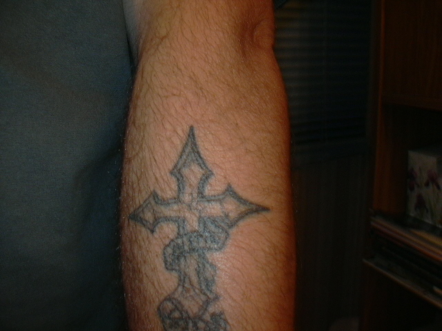 Left forearm has gothic cross with my second sons's name and birthday