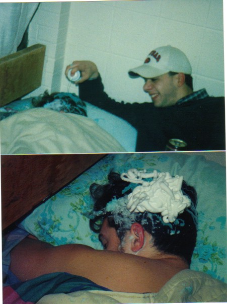 the best one Ive ever pulled on someone was . one of the guys I was partying with passed out from grain alcohol . I went to the PX ( grocery store ) and picked up some nair . on return we proceeded to douse him with nair . all over , every where he had any hair . then wrote on him with sharpies then woke him up saying " we went out and when we came back someone wrote on you " . he then went into the shower to clean up . then there were ear splitting , blood curtaling screams . we did not know that nair burns on sensitive skin . well needles to say when he came into the room he was bald , bald all over . not even an eye brow ! I have pictures !