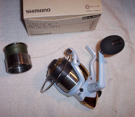 Shimano Stradic 8000 FH. Like new , only used a few times. 2 small scratches, but otherwise perfect. 1 spool is loaded with 20# fireline. Other spool is loaded with 30# power pro. $125, will consider trades...