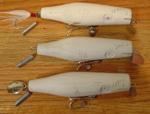 I put the appropriate lead next to each plug so you could see how its weighted also wrote on the plug the lip used. Hook size listed too.