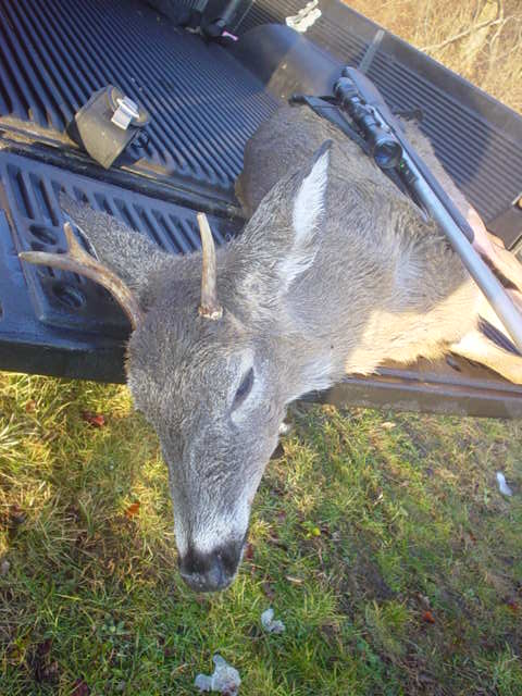 Man it was a fruetrateing year all through bow and shotgun! Determined I told the wife all I want is a blackpowder gun.  Couldn't get out till the 30th, jumped two does that offered no shots. The last day headed back to the same woods with Billy again. Took a stand for an hour or so radioed Billy told him I was going to find them. Still hunted slowly jumping them in a knockdown coverd with briers. Got a decent going away shot and found a decent bloodtrail but the light colored blood and spray I knew the shot was probably clipped around the lungs and back a little. Tracking it was insane! We waited a while, Billy got out of his tree stand had him go ahead where the deer was going and we jumped that deer and another one with it. Decided to wait another half hour getting all our gear together and started tracking up almost to the main road, by a house through some nasty thickets and the deer circled and went right back on its tracks! Jumped the deer again and actually got a shot off, found its tracks withe no blood, tracked it for a while all the time I'm saying this has to be a differant deer, gave up on it. Billy and his bottomless pit needed food so he went to the store. I was determined to find the deer, went back and started down the bloodtrail but soon knew it wasn't right. Headed the other way and noticed a bloodtrail going off with the deer down ten feet away. Radioed Billy and pulled the truck to 20 feet away! Yah I think I like this blackpowder gig!