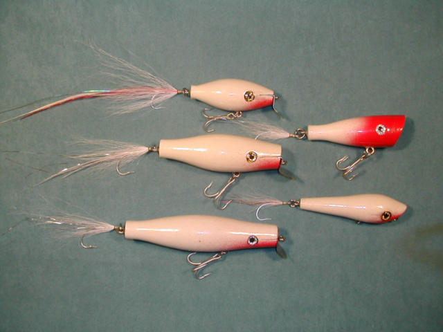 Three Danny plugs, a small Cutty Hunk style and a small maple Spook style guy that would have been better made out of a lighter wood.... I'm intrigued with the idea of adding a touch of red to the tails of these like I did on the top small Danny.