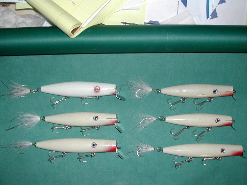First batch finished. Will need to tweek hook locations. Top left, original Musso surface swimmer. Immediatly below are plugs with NJT Lefty 2 lips, one belly weight and then two belly weights. On the right, top two have NJT 1 Lips and one an then two belly weights. Bottom right is with NJT Danny2 lip and one belly weight. They go swimming today. Next batch is a much more consistent rendition of the body profile (size and profile). They're painted and waiting for epoxy....