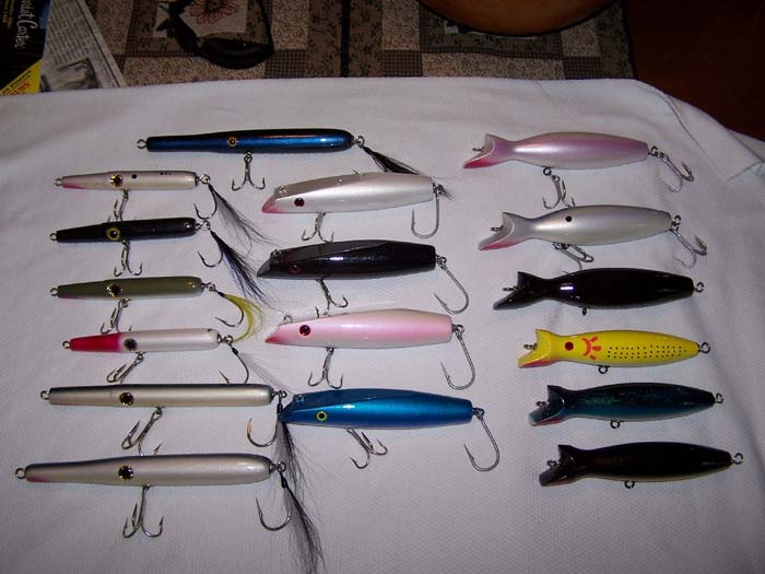 I've got my stash almost done, right now I have a few needles, Howdy's, Danny's, and Spooks that I made. I have a couple of BF poppers, one of which is a "Cutty Popper". I have a Steelhead Danny that is going to get a lot of abuse early in the season. A couple of Afterhours Spooks that have a certain area written all over them. A Mac Pikie and Needle, BM Needle, A few Habs needles that are going to be thrown unmercifully into the surf at PI as well as some Mambos and Bombers and I also picked up a couple of Tins to try this year.