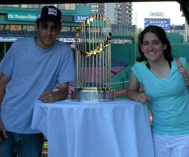 My daughter works for duck tours during the summer and they hosted a party/cookout at Fenway. As you can see in the pic her and my son got to see a certain trophy and get their pictures taken with it.