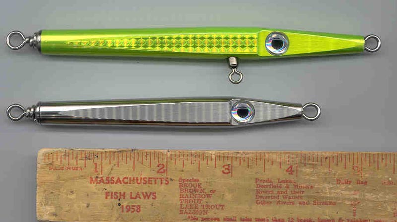 No idea why there are vertical lines in these but I used my scanner for picture. I have had a problem with the powder coating. The powder paint sticks fine and the finish looks great, much better than photo, but when you put the grommets in both ends and pull the wire tight and do your wraps it causes the powder paint to move a small amount on the ends where the grommets are pushing into and thus the salt water gets under the paint and causes corrosion. It only happens on the ends the rest looks great. Rinsing in fresh water helps but eventually it will get to it. Epoxy might give them a little longer life but salt will get to it too. Just have to use them as long as they last then glassbead and paint again. The silver one is hollow stainless so I don't have to worry about that with that one. Only drawback is it weigh's more. Back to the drawingboard again. I am not giving up, stubborn Irishman you know. I am kind of hooked on the dimensions and look of the lure so I am making copies out of wood up to 9 inches right now and they look promising and no corrosion. Paul