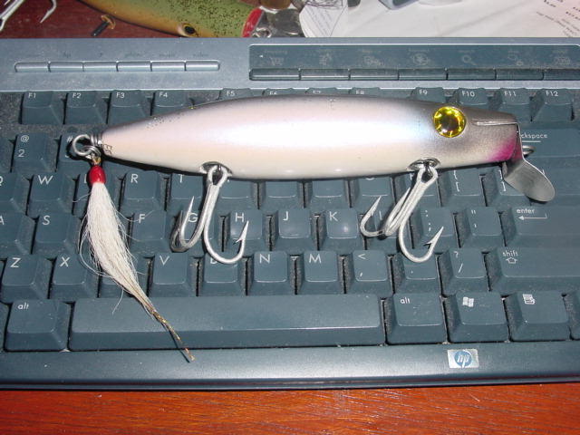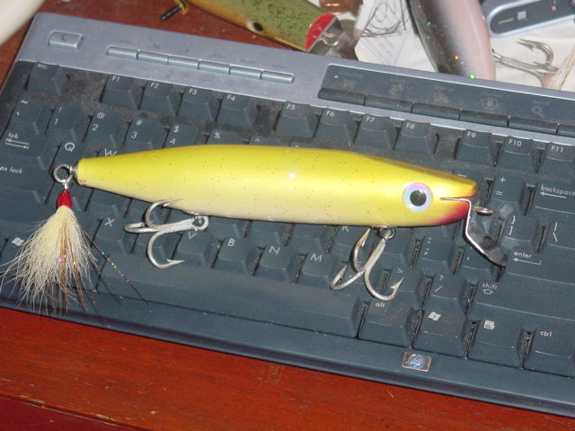 the darter I made from the same batch did not hold up well on the rocks of RI.Though it did work an has plenty of life left.It was still dissapointing.I hate epoxy.the dark back one is a Lefty- Musso type.Jokin wit ebbe(same name fowards an back) i called them righty's..It has a cool blue hue on the bottom of the dark side an a cool irredesent belly very fishlike.I kinda got the color scheme from a great plug master Mr. Pogie.although not as nice as one of kevin's.I hated to let it go but was ok wit it when the finish turned out crappy.